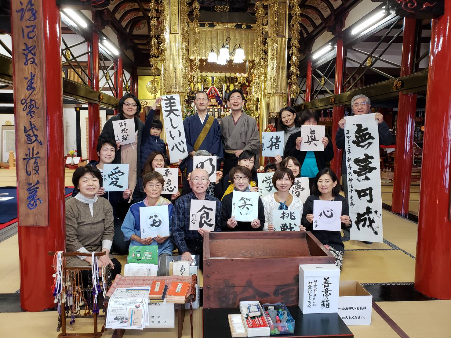 臨床宗教師であるメンバーのお寺、妙法寺で「元ちゃんハウス」の看板の書を書いてくださっている阿部豊寿先生のご指導の下皆様がそれぞれ自分の心にある字を書初めしました。