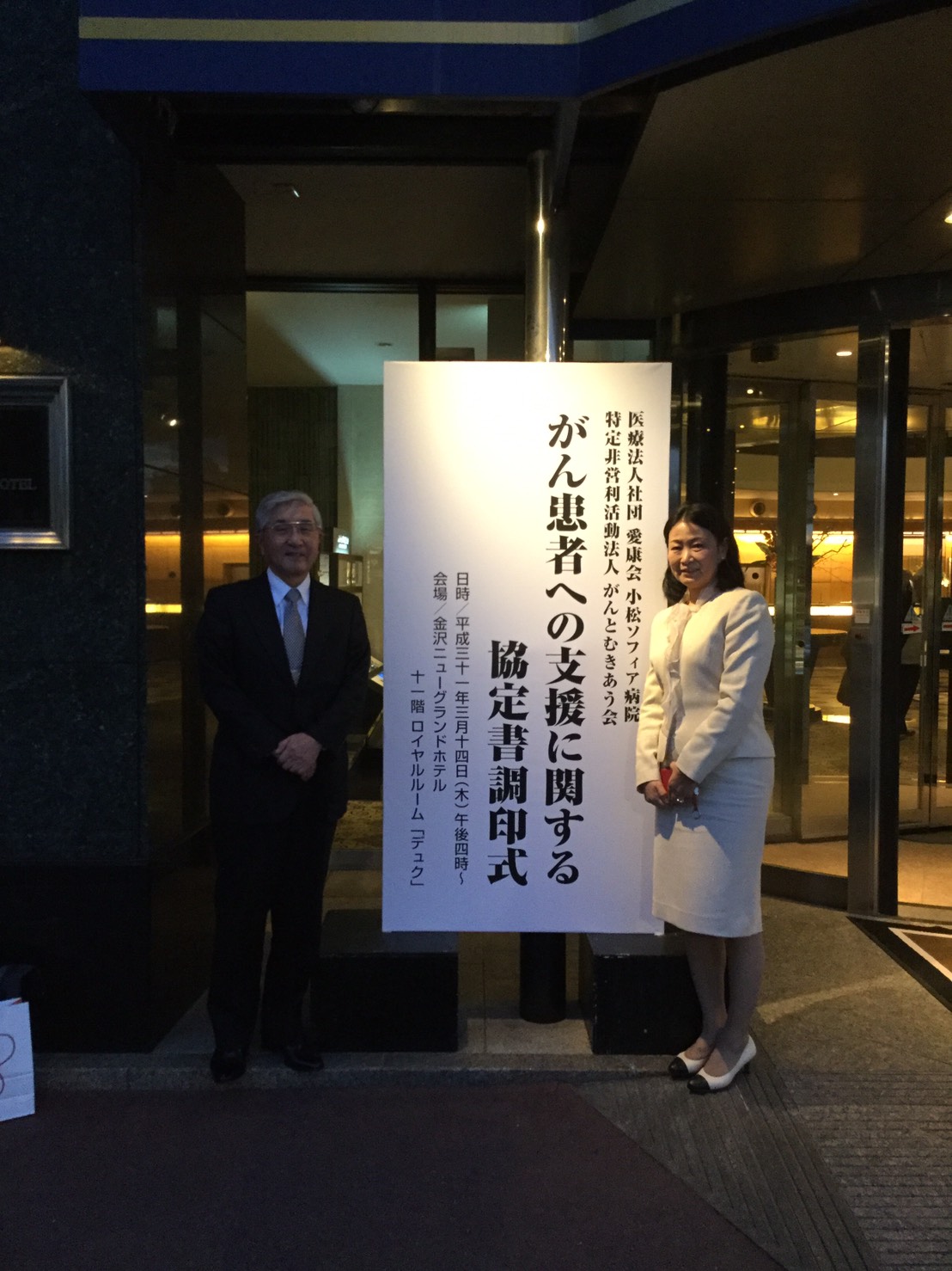 本日、私達認定NPO法人がんとむきあう会は、医療法人社団愛康会小松ソフィア病院と、がん患者への支援に関する協定調印式をとり行いました。小松新イオンのソフィアテラスという場所で月に二回の 開催にはなりますが、南加賀地区のがん患者さんやご家族などの皆様の為の、病院の外の生活の場での支援の場づくりに尽力出来ることは大変嬉しく思います。私達の理念をご理解ご賛同いただき協定を結びましたこと、加藤理事長はじめ皆様には心より御礼申し上げます。亡き前理事長も元ちゃんハウスが1箇所ではだめで、そのような場が沢山出来て初めて本当に必要性が認められると言っていました。他への場づくりを支援する意味でも大変意義のあることです。素敵な場になりますよう、私達の思いをお伝えしたいと思います。