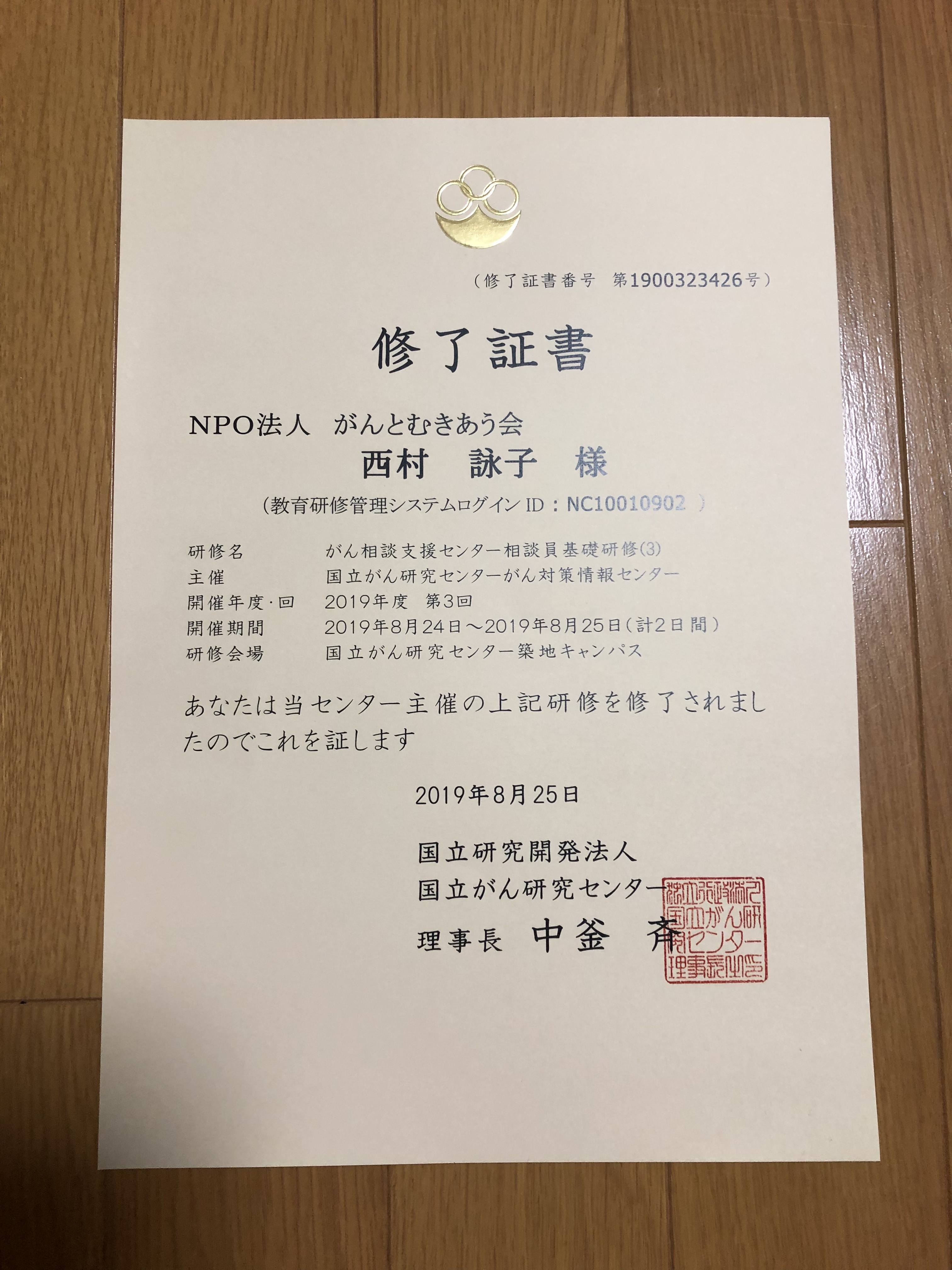 元ちゃんハウスは病院の中の相談支援の場ではありませんが、色々な思いを持って来てくださる患者さんやご家族の方の少しでもお力になる為に、私達スタッフもスキルをあげないといけないと思っています。がん相談支援センターでは、国立がん研究センターがん対策情報センターによる「相談支援センター相談員研修・基礎研修」(1)~(3)を修了した専従及び専任の相談支援に携わる者をそれぞれ1人ずつ配置しています。元ちゃんハウスは病院ではないですが非がん診療連携拠点病院の人も学ぶ事ができました。
