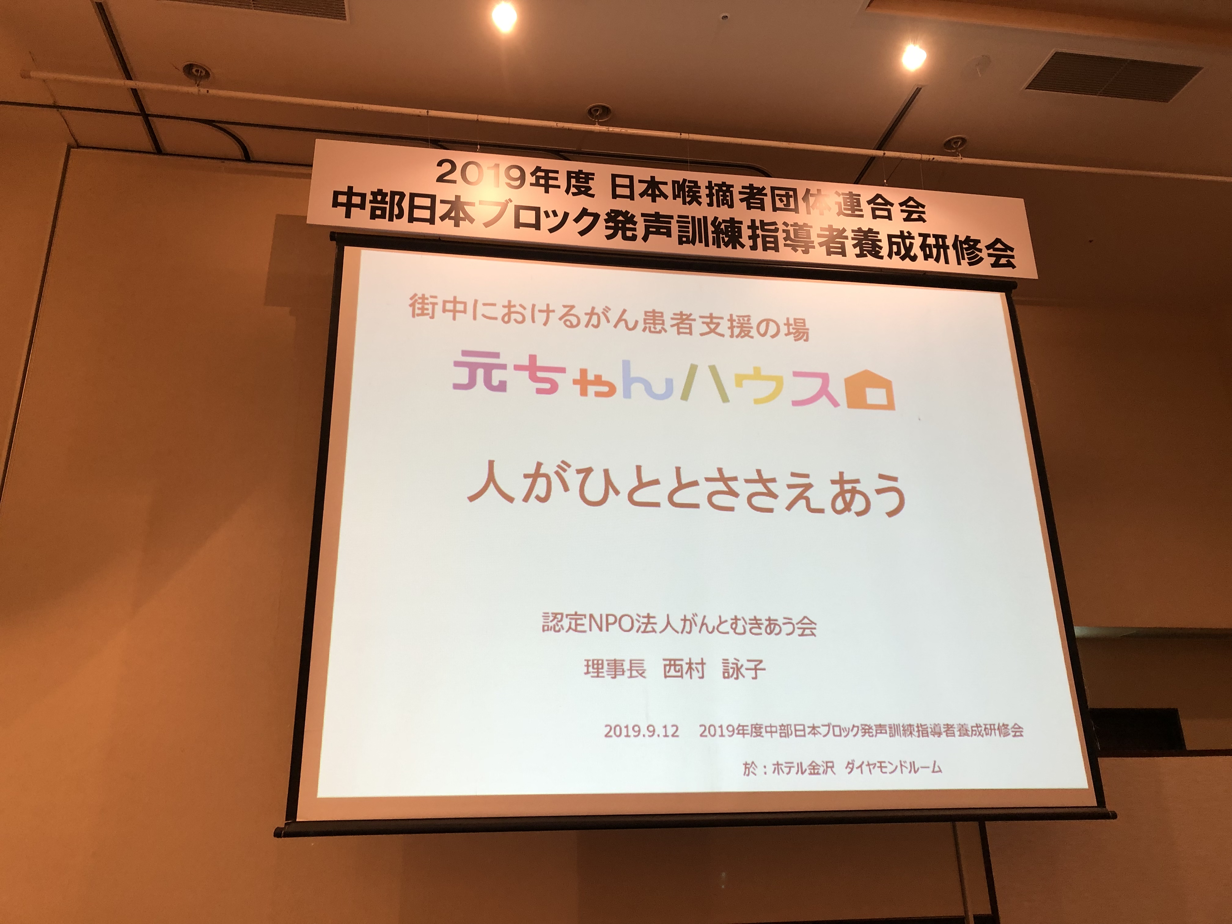 今日は日本喉摘者団体連合会 中部日本ブロック発声訓練指導者養成研修会で元ちゃんハウスで「人がひととささえあう」というテーマでお話させていただきました。喉頭を摘出され食道発声や人工喉頭で発声されている方やご家族の集いでした。皆様は一時声を失い訓練して再びお話出来るようになり、そして発声指導者として、新たに患者さんとなった方を支えていらっしゃいます。もしかしたら、声だけではなく沢山のことを失って・・でも強く生きておられる!一生懸命に発声している、その一言一言が尊く聞こえます。お話になるせっかくの宝の様な言葉が、愚痴や悲嘆的な言葉だと悲しいです。悪いことを語ることなく、良い言葉だけ語れますようにと思います。