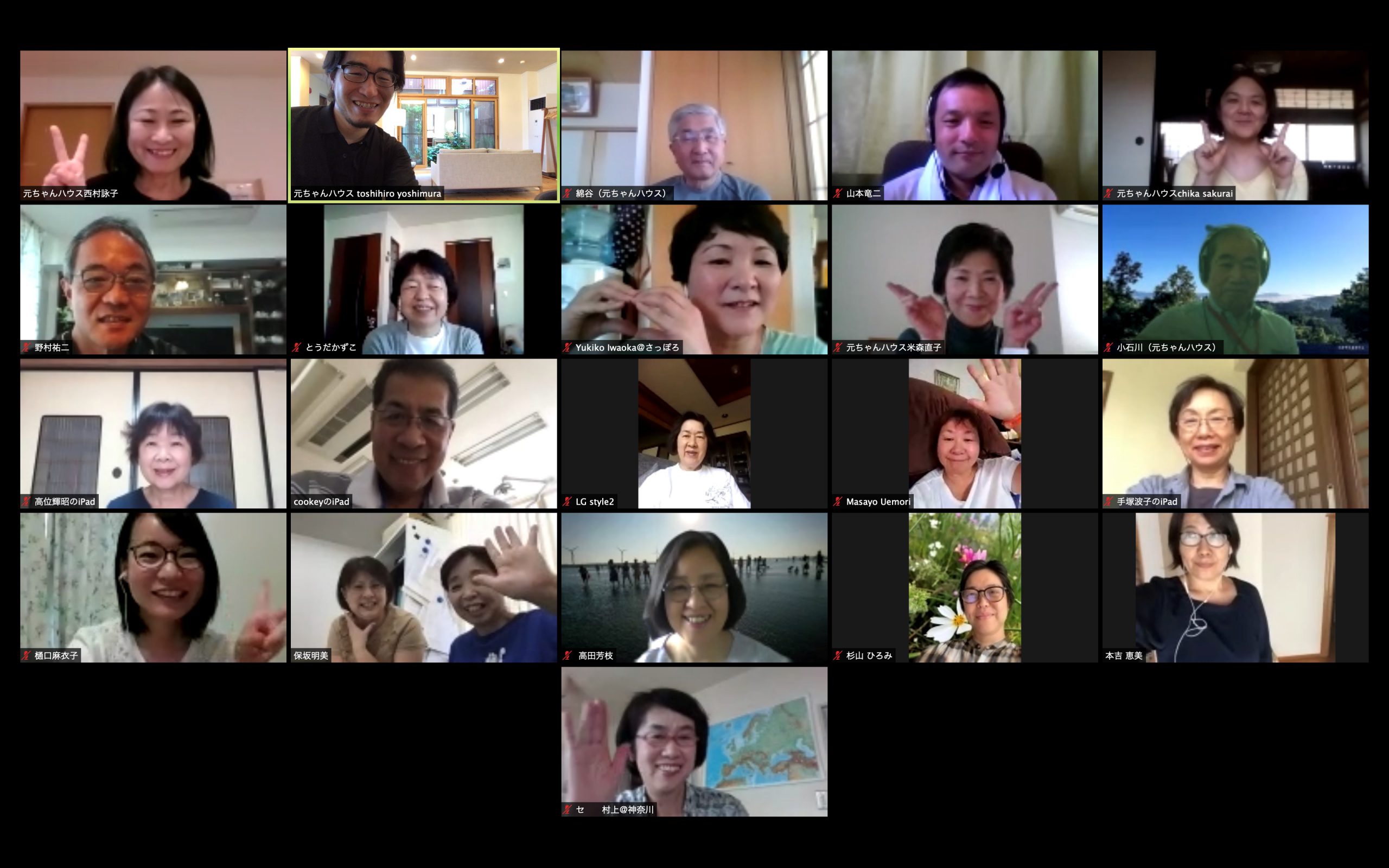 私達は今年初めての企画として賛助会員の方々に日頃からの感謝をお伝えしてこれからの元ちゃんハウスを一緒に考える時間を持ちたいと思って30日にファンミーティングを予定していました。しかし今の状況では休館中でもあり開催はできないので、賛助会員にこだわらずいつも応援してくださる方にZOOMで参加して頂きました。私がスライドを使って昨年度の活動報告と館内のビデオ撮影したのですが、スライドは切り替えられないし、カメラは起動できないし…ドタバタでした。昨日練習したのに・・。でも、皆さんが温かく見守って下さってメンバーにも助けてもらってなんとか無事終わりました。利用者さんのお話や、今度是非いってみたい、なぜずっと居たくなるのか?といううれしいお声もいただきました。東京、栃木、遠くは函館や札幌などからの参加がありZOOMならではでした。本当にご参加頂き有難うございました。私達がエールをもらいました。6月1日から再開しますが、元ちゃんハウスのコンセプトである予約無し、制限時間なし、名前も聞かず・・・という形がまだ難しいので安全第一にできる形から始めます。フィジカルディスタンスはとりますが、気持ちは今まで以上にお近くにと思っています。