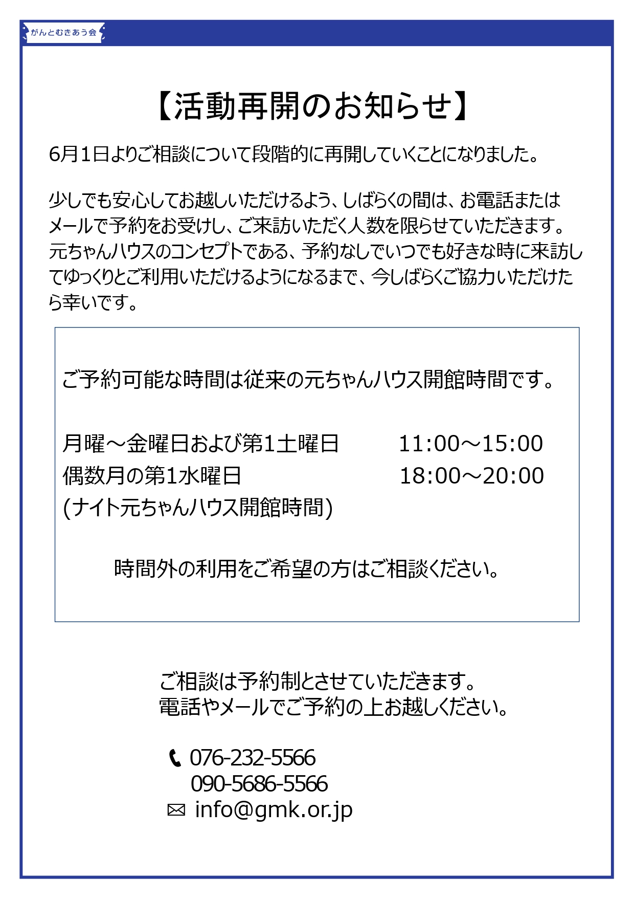 元ちゃんハウスは今日から予約制ではありますが再開しました。今までの開館時間内で予約の上お顔を合わせお話をさせて頂きます。今週の水曜日3日は本来はナイト元ちゃんハウスですが皆でワイワイお話することはできませんが、個別でお話されたい方は是非お電話ください。又、開館時間以外でのご希望があればできるだけ対応させていただきます。どうぞご相談ください。なお、来館時は感染予防対策にご協力ください。