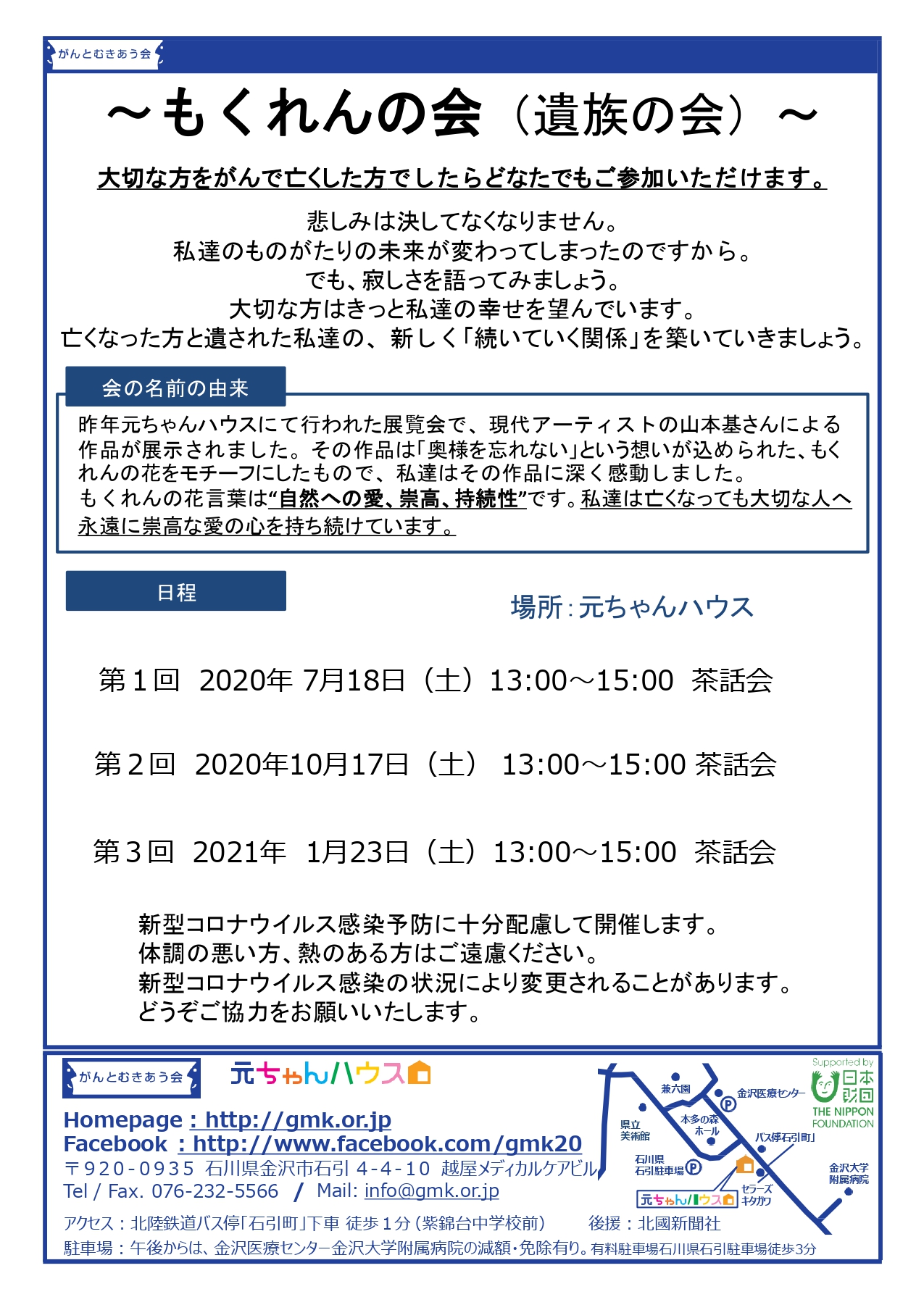 主人は自分の時間がもうないとわかった時に私の事を心配していました。私も主人に「お父さんはいいよね、私がいるから。私がこれから病気になった時や困ったときはどうすればいいんだろう?と言った時に、「やっぱり元ちゃんハウスを作ろう!」と言いました。自分の命があとどれくらいかわかわからないのに、本当に作っていいか迷っているとき、その会話が背中をしたのかもしれません。私もがん経験者なのですが、がんになったら誰でも1度は死を覚悟するのではないでしょうか。そして自分のいなくなった後は家族がどうなるか心配します。そんな時、「辛かったら元ちゃんハウスに行ったらいいよ!」と言ってもらえるような元ちゃんハウスでありたいと思います。そのための元ちゃんハウスだと思います。遺族の方から「この辛い気持ちをどこで話していいかわからない」と言う声をよく聞きます。どうぞもくれんの会に来てください。予定の3回以外にも、個別の面談はいつでも構いませんのでお電話かメールでご連絡ください。