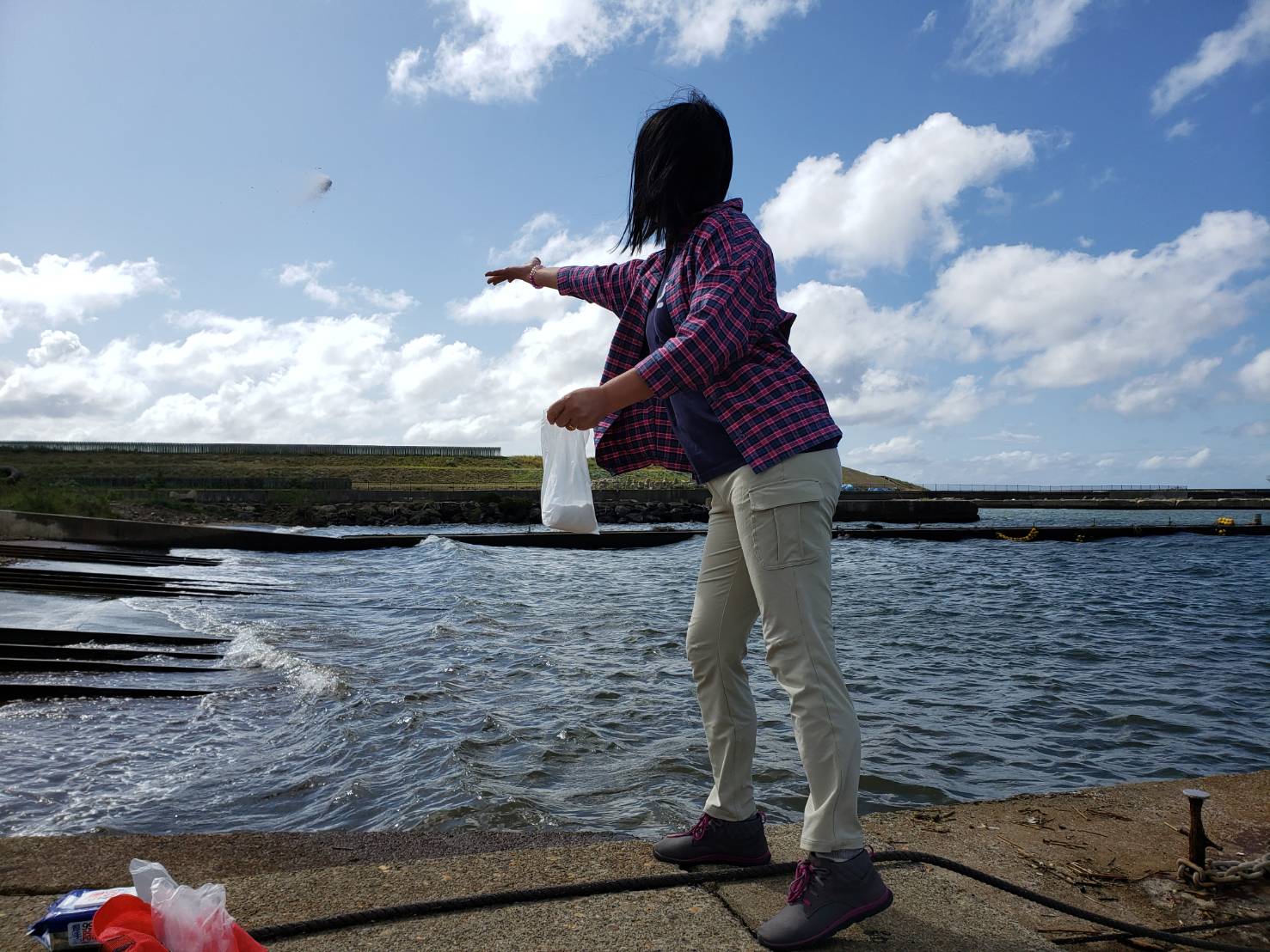 山本さんは作品の最後は”海に還るプロジェクト”として作品で使った塩を海に還します。終わってから2年経ってしまいましたが、ようやく大野の海へ還してきました。メンバー全員で返しに行こうと思っていたけれどなかなか日が合わず、そのうち、手放すのが寂しくなり、大切に持っていました。でも、リレーフォーライフもできなかったし、がん征圧月間の9月も終わるし、コロナ禍の中、ご家族を見送った方々の悲しい思いもお聞きしているので、今日、仲間の米森さんと一緒に、金沢の大野の海に還してきました。大切な人を忘れないという想いの詰まったの作品の塩です。私もいろいろな思いを込めて戻しました。