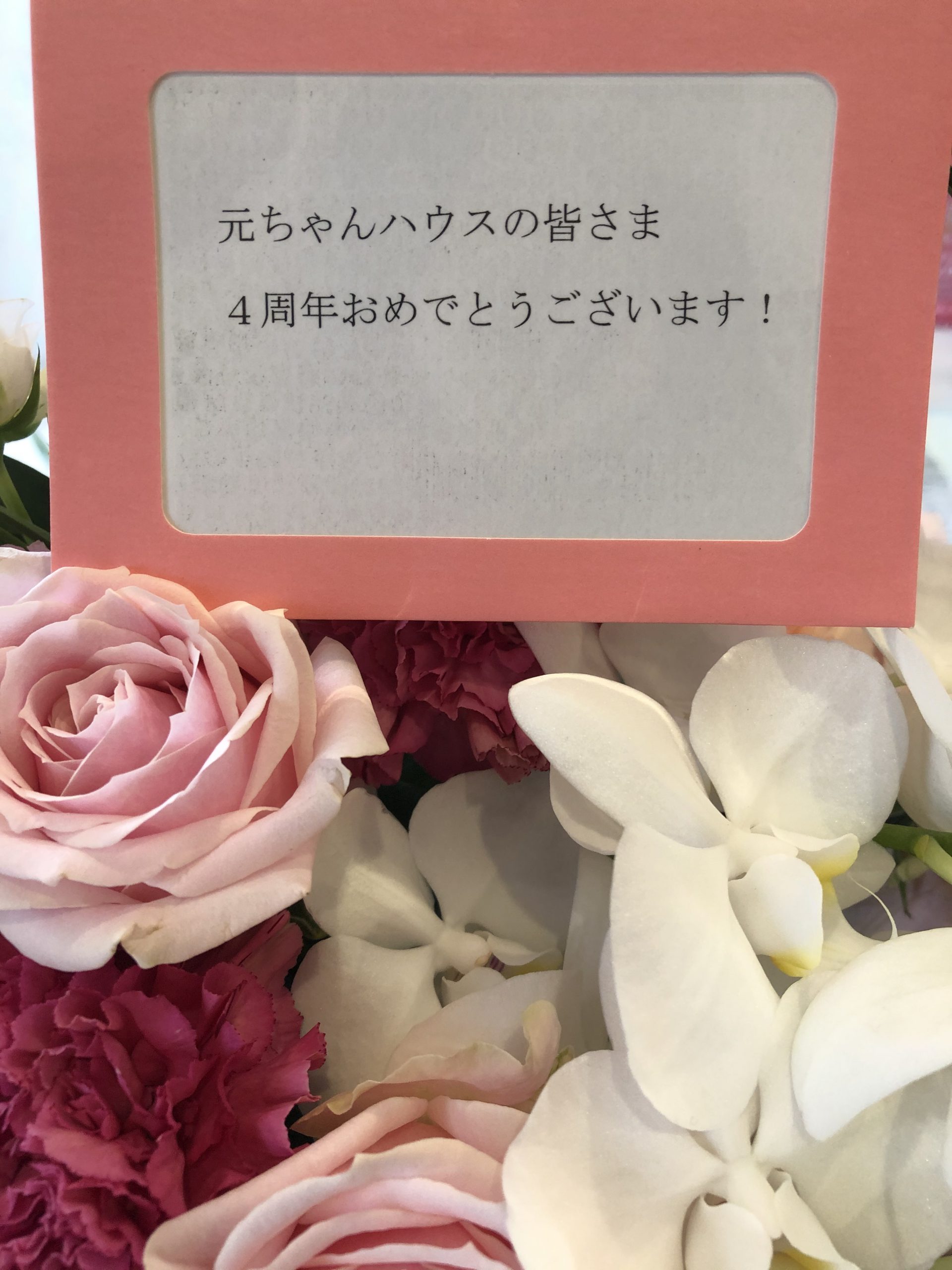 4年前の明日は元ちゃんハウスオープンの日でした。前理事長がテープカットできたことにメンバー一同安堵したことを思い出します。2015年病気がわかった時に前理事長の主人がが作る!と決めて2016年5月に世間に公表してから半年後のオープンでした。今年はこのコロナ禍で本来の活動が出来ず、12月6日の第10回金沢一日マギーの日の開催も3月に延期し、つながりが薄くなるような感じがして寂しく、心晴れない今日でしたが、お花に癒されパワー充電できました。できることをして続けます。皆様の応援のお陰で5年目を迎えることができます。本当にありがとうございました。