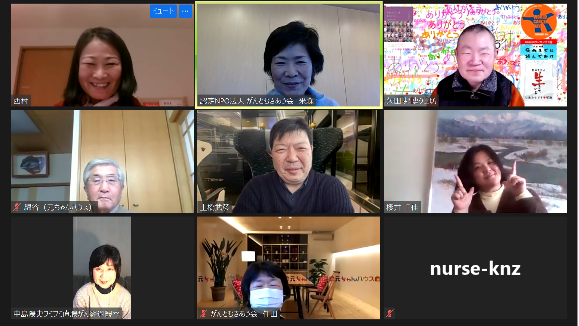 今日の多職種とおしゃべりしよう!は名古屋、和歌山、東近江からの参加がありました。お一人の方の参加からその方の患者会に出た方や、ブログを読んだ方がこの会を知って下さって参加してくださいました。コロナ禍ではありますがこの広がりがとても嬉しいです。金沢大学附属病院から看護師さんも参加して下さって、本当にワイワイおしゃべり出来ました。多種職でのおしゃべりですが、別に医療職に限りません。今日は電車の運転手さんの参加がありました。その方が病気になっても自分で働きやすい環境を作っていったお話も聞けました。色々な辛いこともある大変な体験だったはずですが、今は次に患者さんになるかもしれない方の為に、また、同じ思いをしている方の為に笑顔で寄り添っている尊いお話でした。また、病気になって治療を終え一段落された方が、思い切って新たな一歩を踏み出して参加してくれました。本当にお疲れ様でした。そして患者も医療者も今は一番の関心ごとである、それぞれの立場でのワクチン接種についても話しました。今後も正しく情報交換していきたいです。また、看護師さんからもがんになった時に何が役にたったか?という問いを貰い皆さんの体験を聞きました。きっと今日の患者さんからの学びが明日からの患者さんへの学びに繋がります。