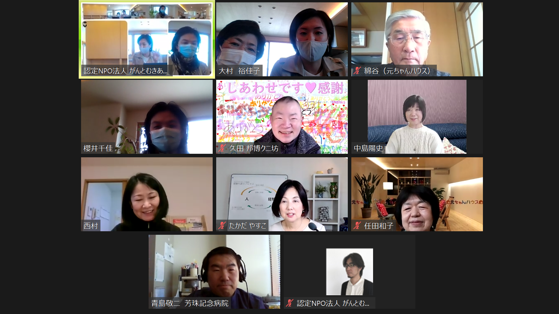 今日は定例の゛おしゃべりしよう!”でした。県外からの参加もあり、桜情報の交換から始めました。元ちゃんハウスからは、いつも色々お手伝いしてくれる若い力の金大看護学部の院生や、患者さんが「ZOOMはできないけど、どんな雰囲気なのか見てみたい」と参加してくれました。今日は初めて、いつもは仕事中だから行けないけど、ZOOMでなら参加できると芳珠記念病院の先生そして、いつもの金沢大学附属病院からは緩和ケアの看護師さん達の参加もありました。20日の清水研先生の講演を聞いた方は感想を言いつつ、参加しなかった方と感想を共有しました。そして患者さんからなかなか、お医者さんと話せないという患者さんあるあるの話をしてランクの意識を以下に消すか・・・という深いお話をしてくれて、医師の先生も笑顔で聞いてくれました。最後は好きなアイドルの話まで楽しくあっという間の時間でした。反省はまた、私がしゃべりすぎた!ということでした。ご参加頂きました方々、ありがとうございました。