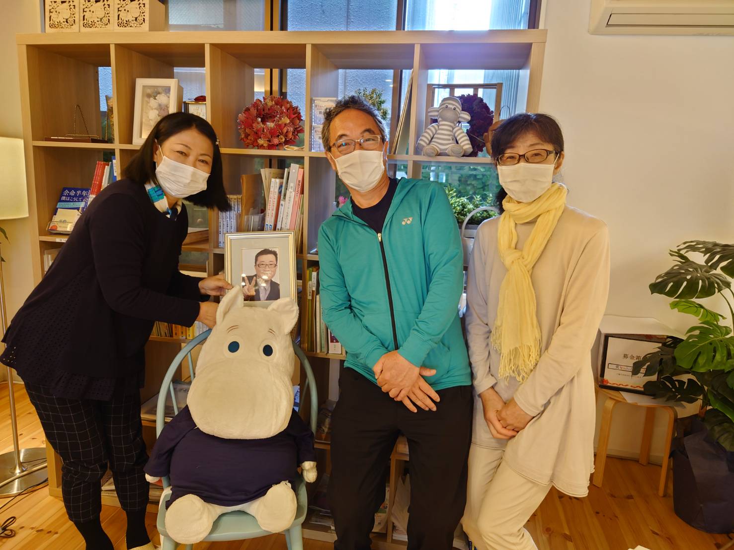 兼六園のお花見の後、主人の同級生の野村先生ご夫妻が元ちゃんハウスに来てくださいました。ちょっとうらやましいです。素敵なご夫婦です。奥様のお母様を思う先生の優しさに感激しました。先生と奥様が優しく聴いてくださるので、ついつい、日ごろの悩みや迷っている事を話してしまいました。毎日、来てくださる人のお話しを聞く立場ですが、やはり、私も聞いて欲しかったんだなあと思います。先生のような先生が増えると患者さんの悩みは減るように思います。最後に主人も一緒に記念撮影しました。