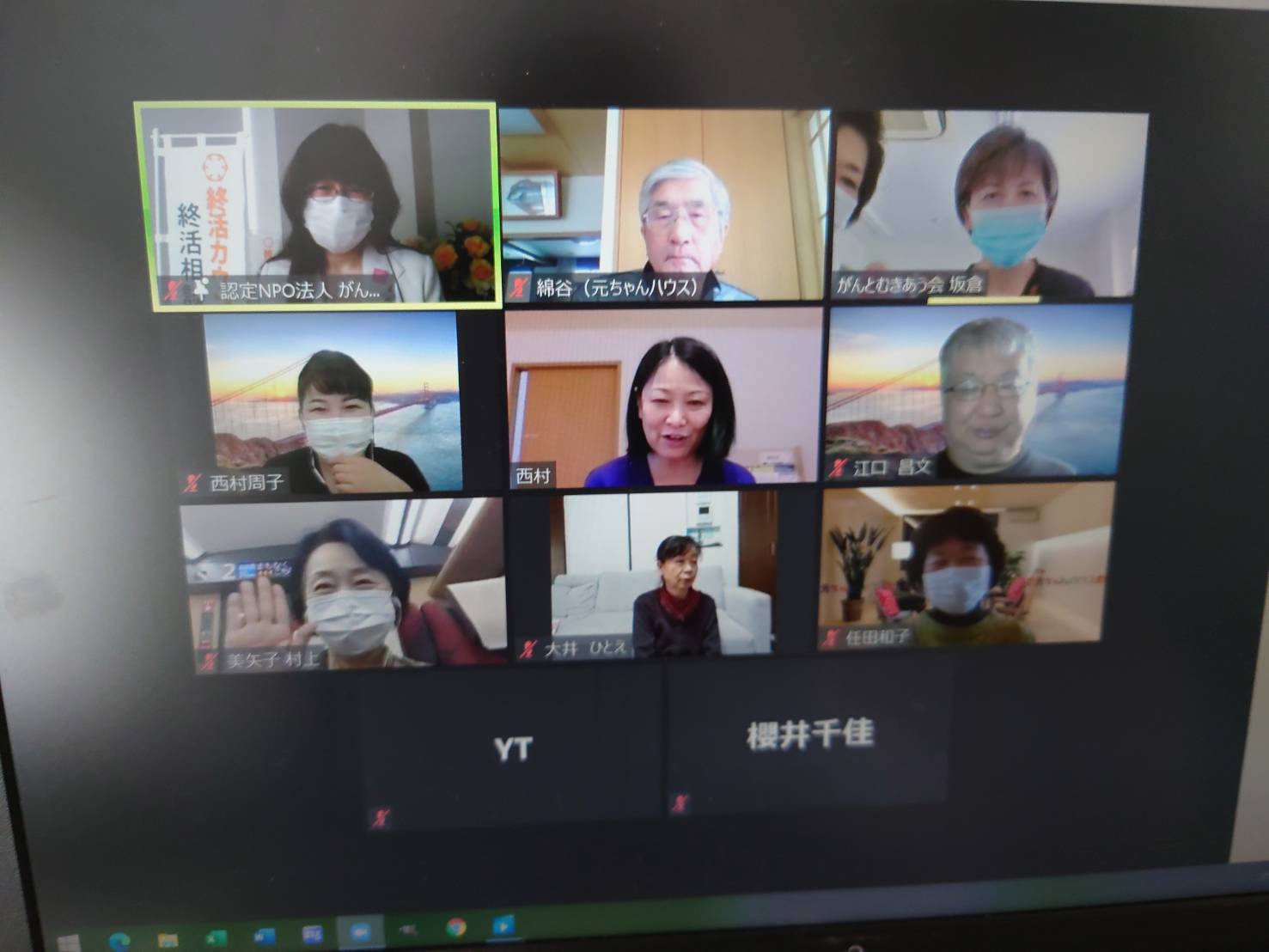 ZOOMによるオンラインと元ちゃんハウスのセミナールームからの参加のハイブリッド形式で行いました。実は、このお話は昨年の4月に予定していました。しかし、新型コロナウイルス感染流行で中止したので、一年越しのお話となりました。がんの方でだけでなく、コロナ禍や震災等で、当たり前の日常が当たり前ではない事を実感しています。そんな中、日ごろから自分の為、そして大切な人の為に終活は大切なものなんだと思います。宮森さんは、エンディングノートについてお手持ちの4冊を紹介し、自分の書きやすいものを選ぶこと。1冊は家族用として財産や年金など相続に関することを記載する。もう1冊はだれが見てもいいノートとしておくとよい。など、具体的にも教えてくださいました。今はアプリもあるそうで、日記のように書く事も出来るそうです。終活…言葉は何となく重いですが、自分はどう生きていきたいか、自分の”生きる”を大切に考えたいと思いました。