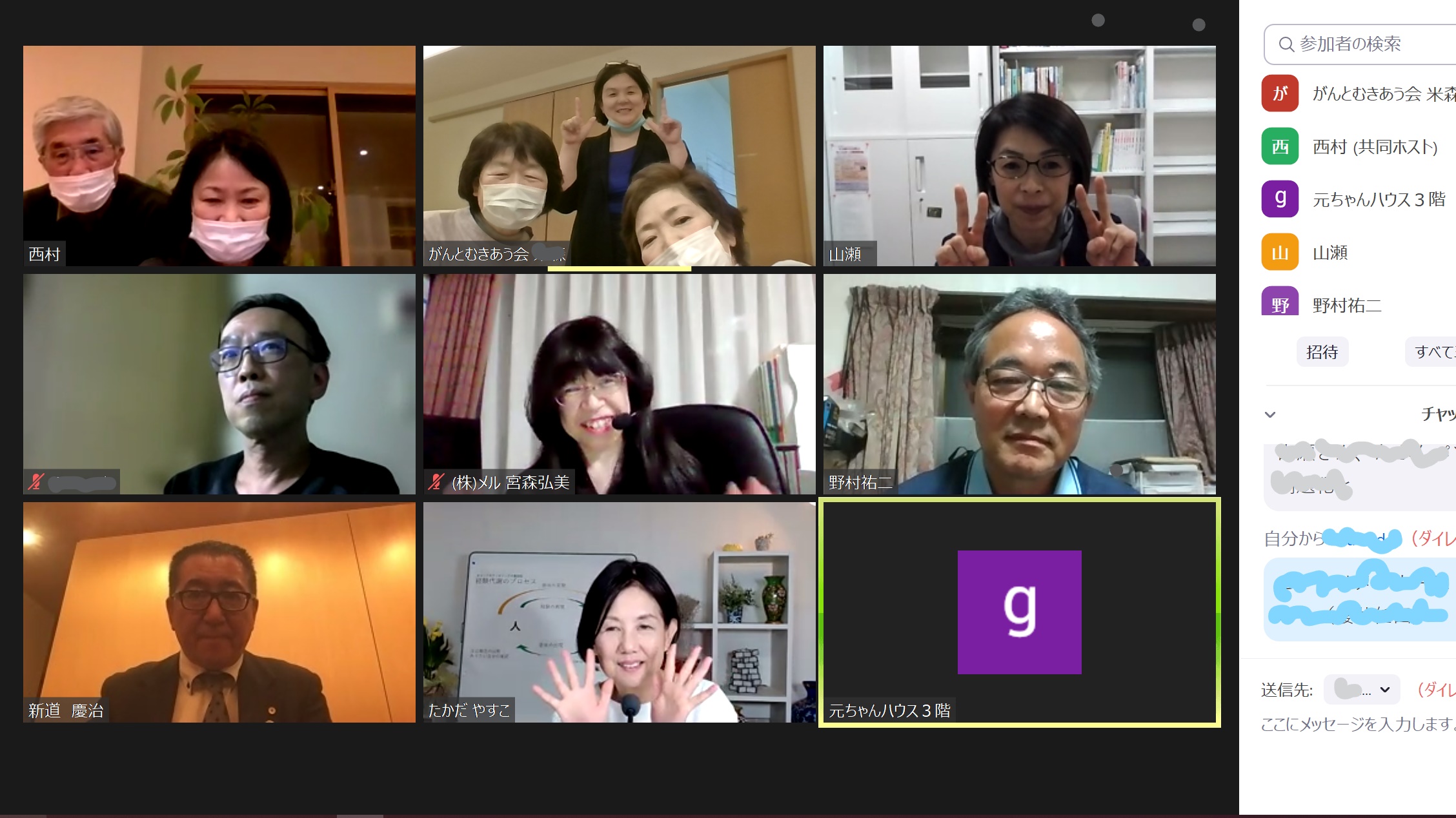 今までのナイト元ちゃんハウスはスタッフ3~4人が来訪者の方とお話するだけでしたが、今日からはZOOMでの参加と元ちゃんハウスへ来た方と一緒にお話をするハイブリッド形式でした。昨日購入したばかりのマイクを使ったのですが、不慣れなためかうまくつながらなかったり、元ちゃんハウススタッフがオーディオを切れずにハウリングするやら、パソコンのカメラが作動しなかったりと、バタバタで始まりました。でも、参加して下さった方々は優しく見守ってくれました。次回はもっとスムーズにします。すみませんでした。患者さんや、在宅の先生や、終活カウンセラー、社労士さん、キャリアカウンセラーや当会のスタッフの歯科医や看護師、管理栄養士、ピアサポーターでお話しました。参加者から、当事者の方を囲んで、皆さんがあたたかい目で見て聴いて頷いておられて良い時間でしたと仰っていただきました。参加者のお一人がビールを飲んでいらっしゃって、みんな羨ましい!と。そうだ、ZOOMだから飲みながらでも良いんだ!次回は飲み会でもいいのかな、お茶でもお酒でも!気軽にいろんな悩みや気がかりや、病気以外の楽しい事なども話題にできたらいいなあと思います。次回は6月2日です。