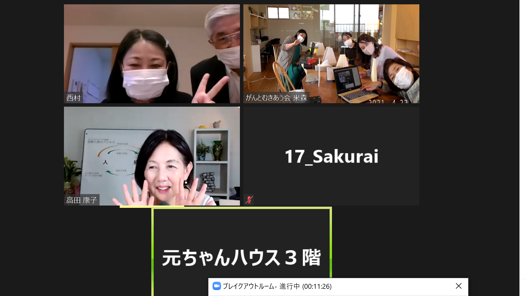 なかなかコロナ禍以前の様には行きませんが、(玄関横で手洗いしてからあがってもらい、1階と3階を使い、広さも十分確保し、窓を開けての換気、アクリル板も設置して感染予防に気をつけながら)今年度初の第4火曜日は元ちゃんハウスに集いました。開館11時から予約の方が次々に来られて、私やスタッフとおしゃべりしたり、相談したり、アロマオイルでハンドマッサージを受ける方もいました。病院勤務の看護師さんも以前から気になっていたけれどなかなか来れなかったと見学に来てくれました。ZOOMでのおしゃべり会は13時から1時間でした。30分以上前から準備したのですが、ビデオカメラの三脚がうまくセットできない(;’∀’)そのうえ、なんと!Wi-Fiが繋がらない!と焦りました。なかなかZOOMになれません・・申し訳ありませんでした。ご参加下さった方は温かく見守って下さいました、有難いです。次回はもっと早くから準備します!反省会もしました。でも、最初だけバタつきましたが始まってからは、ZOOMで参加頂いた方4名、元ちゃんハウスから6名、スタッフ5人と賑やかな時間でした。患者さんからお勧めの本や映画を教えてもらったり、コロナ禍のゴールデンウイークの過ごし方を考えたり、アロマの香りで癒される話など・・・。金沢大学附属病院からはがんの専門の看護師さんが参加して下さったので、初めて、ブレークアウトルームで個別相談も出来ました。皆様、是非またご参加ください。ZOOMでお会いするのも良いですが、やはり元ちゃんハウスに話し声や笑い声が聞こえる事がうれしかったです。