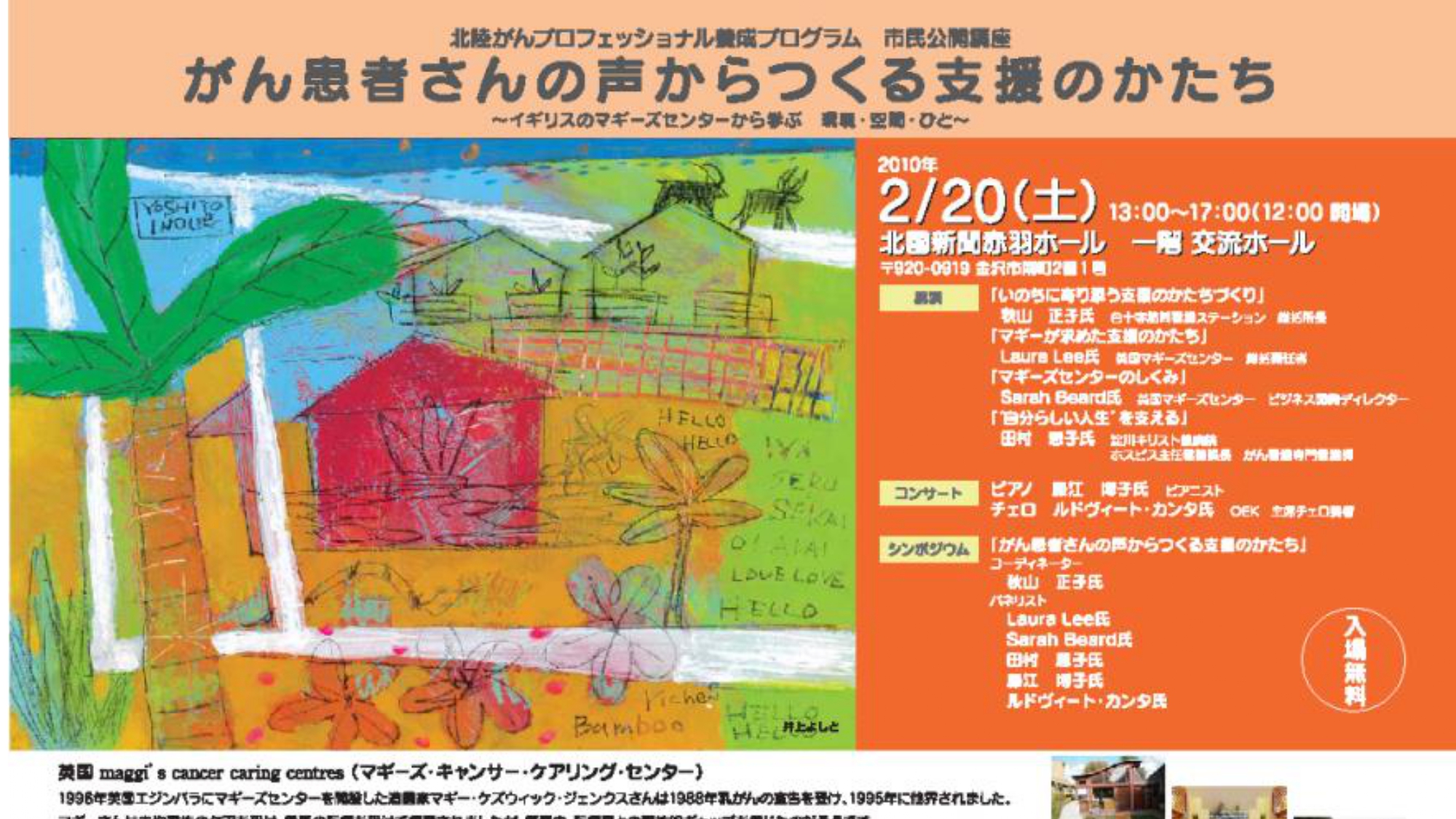 今日はうんチッチ相談のご予約は無かったので榊原さんとゆっくりお話しできました。榊原さんは今から10年以上前、金沢大学看護学部にいらした時、そして前理事長の主人が金沢赤十字病院に勤めた時に出会い、金沢元気が出る患者学やがん患者から学ぶがん医療、チーム医療の学びを一緒に進めていたそうです。(その時私は主人の活動は知りませんでした。(-_-;))そしてマギーズ東京の秋山正子さんと出会い、イギリスのマギーズケアリングセンターを知り、2010年2月に北陸がんプロフェッショナル養成プログラムの市民公開講座「がん患者さんの声からつくる支援のかたち」の開催、金沢一日マギーの日につながり、それが今の元ちゃんハウスにつながります。榊原さんをはじめ、その趣旨に賛同した仲間がずっと一緒に活動し、主人の願いを叶え今も一緒にいてくださる事が本当に有難く、改めてこの流れを絶やしてはいけないと思いました。そして初めから主人たちの活動は「患者さんや家族の声から生まれたもの」でした。医療者と患者・家族が同じ場で対等に話し合える、患者さんから学ぶという姿勢はこの時から始まっていたのです。元ちゃんハウスでも初心忘れるべからず、主役は元ちゃんハウスに来て下さる方です。その方たちの声を大切に活動していくことを改めて誓いました。