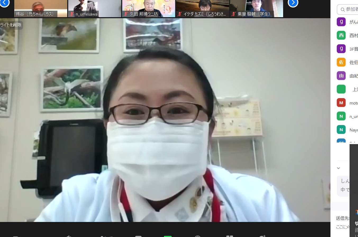 今年最後のおしゃべり会は元ちゃんハウスから9人、ZOOMで11人の今年最高の参加者がありました。患者さん、ご家族、お友達、医学部生、患者さん支援の方など色々な立場の方の参加がありました。金沢大学附属病院のがん看護専門の佐伯さん参加があったためか、シビアな病状の急な告知を受けてショックな中、どんどん治療が進んでいく中での様々な心配事、疑問に対して、また、療養中の不安な気持ちとどう付き合っていくか?などの問いがありました。この問いは多かれ少なかれみんなが思う正解の答え無い問いではないでしょうか。みんなご自分の体験からアドバイスをしてくれたり、看護師さんも優しく丁寧に考えてくれました。みんなが辛い思いを抱える方の事を心配し回復を願っている事がわかりました。温かく優しい時間でした。今日のキーワードは「自分を大切に!わがままになってもいい!不安を書き出してみて、それぞれ対処する!信頼できる主治医の提案にのってみることもあり!アロマなどで気分転換!悩みは多いけど今の悩みをひとつづつ!ひとりじゃない!」などなど。ピアサポーターの精神科医師から「生きる上で過去はヒストリー、未来はミステリー、わからない事を悩んでも仕方ない!自分に正直に!」という言葉をいただきました。おしゃべり会は参加される方々により色々な雰囲気に変わります。来年はどんなおしゃべり会になるか楽しみです。