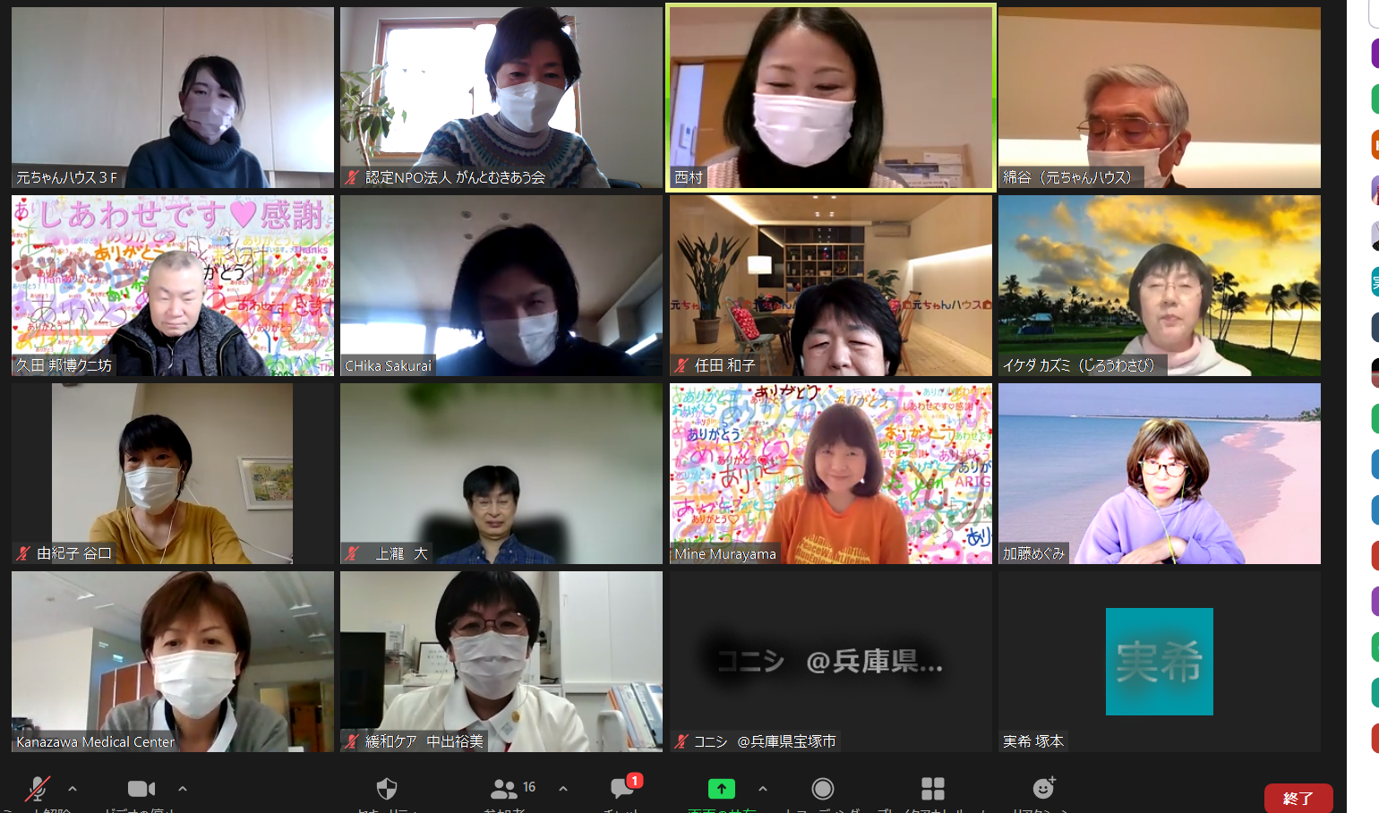 今日のおしゃべり会は、地元の患者さんの他に、名古屋、京都、東京など県外からの参加もありました。オンラインでのミーティングで繋がっている患者さん達が、お声を掛け合ってくださいました。金沢大学附属病院の緩和ケアにくわしい看護師さんと金沢医療センターのがん相談支援センターの看護師さんの参加がありました。石川県もまん延防止等重点措置が出され、2つのがん診療拠点病院の現状をお聞きしたところ、今のところは受診控えや手術の制限などはなく職員の感染予防対策が厳しくなったとお聞きしました。医療者の皆さまには本当に感謝します。参加者の中からはリンパ浮腫への医療、ケアについての質問があり、その地域に寄っての差があるようです。そしてまだまだ、支援が少ない、情報が届かないという実情があります。辛い思いをする患者さんの為に少しでも情報発信をしていかないといけないですね。当会の副理事長の歯科医から、適切な口腔ケアで口の中を清潔にすることは、過去にはスペイン風邪の罹患減少の事実があり、インフルエンザ罹患も高い確率で、効果が認められているので、コロナウイルス感染にもつながることを教えてもらいました。正しい歯磨きとは磨き残しが無いことが大切で、少なくても5分、出来れば10分、少ない歯磨き粉で何回かに分けて歯ブラシも洗いながら行う事が大切!口の中の乾燥も大敵なので飲み物で潤す事、舌の綺麗に!と教えてもらいました。皆さん、続けましょう!夜に1回だけでもきちんと磨きましょう!おしゃべり会が終わった後はルーシーダットンで呼吸法、体を伸ばす事をやりました。生活の中でのちょこちょことした筋トレが大事なので、みんなでやりましょう!と約束しました。