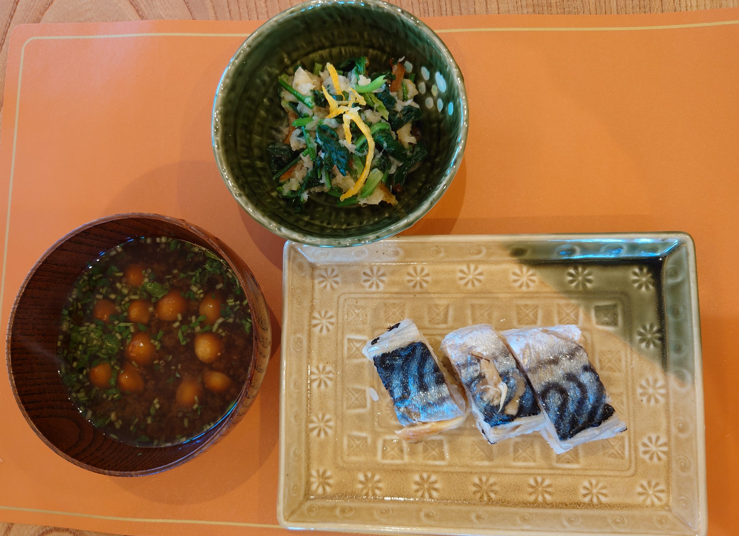 2月5日(土曜日)は料理教室でした。食欲のない方からのリクエストも多いお寿司のレシピです。酢めしに混ぜ込んだ生姜の爽やかさとゴマと醤油漬けのしその実の香ばしさが焼き鯖を食べやすくしてくれました。青菜のおろし和えは、大根おろしに干し柿で甘みを加え、柚子果汁でさっぱりと。なめこの赤だしを添えました。