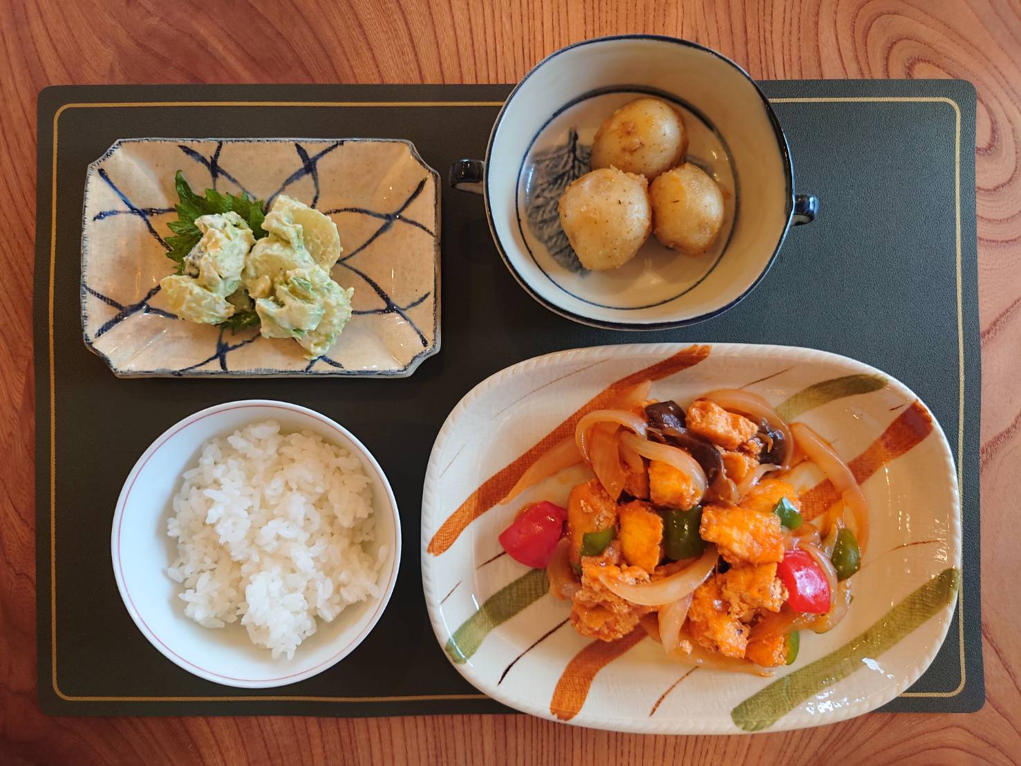 毎月第一土曜日は料理教室ですが、金沢は6月の第1週に百万石まつりで交通規制があるため、6月だけは第2週に料理教室を行っています。昨日はスタッフ他2名の参加者が加わり、‘新じゃが’を使ったメニューに挑戦しました。新じゃがは秋に収穫して貯蔵するジャガイモとは異なり、小ぶりでみずみずしく皮が薄いのが特徴で、皮ごと食べられるのでビタミンCを効果的に摂ることができます。今回は厚揚げの酢豚風、新じゃがの味噌あえ、新じゃがとアボカドのサラダとじゃがいも多めの献立でしたので、この量で満腹に。参加者の一番人気は茹でて味噌とバターで和え黒こしょうをふった新じゃがの味噌あえでした。