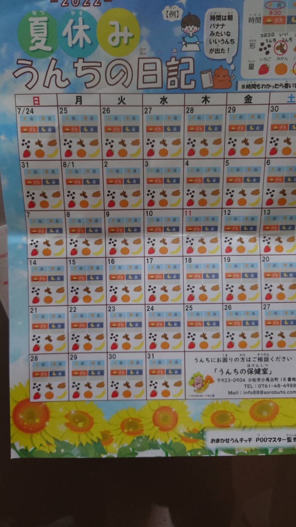 今日はおまかせうんチッチ相談の日でした。男子医学部生も相談してくれました。若い人もストレスの多い毎日でしょうから、いろいろあることと思います。スタッフも最近、便通の変化があると気軽に相談していました。榊原さんから「うんちの日記」をもらいました。榊原さんからは「現代は食生活や慌ただしい生活習慣などで、小学生や未就学児でも便秘の子が多い。中には幼少期から下剤に頼る生活を続け、止めるタイミングがわからず一生下剤を飲み続けるケースもある、そこで、小さい頃から自分のうんちに興味を持ってもらい、気持ちのよい排便につなげられればと、夏休みを利用して観便(自分の便を見ること)の習慣づけしようと話していたら、 スタッフの方が、毎日楽しくつけられるようにかわいいイラストをたくさん使って、「うんちの日記」を作ってくれた!」と話してくれました。是非、お子さんのいる方にお配りしたいと思います。このうんち日記を通して、家族の間で自然にうんちの話ができるようになってほしいです。