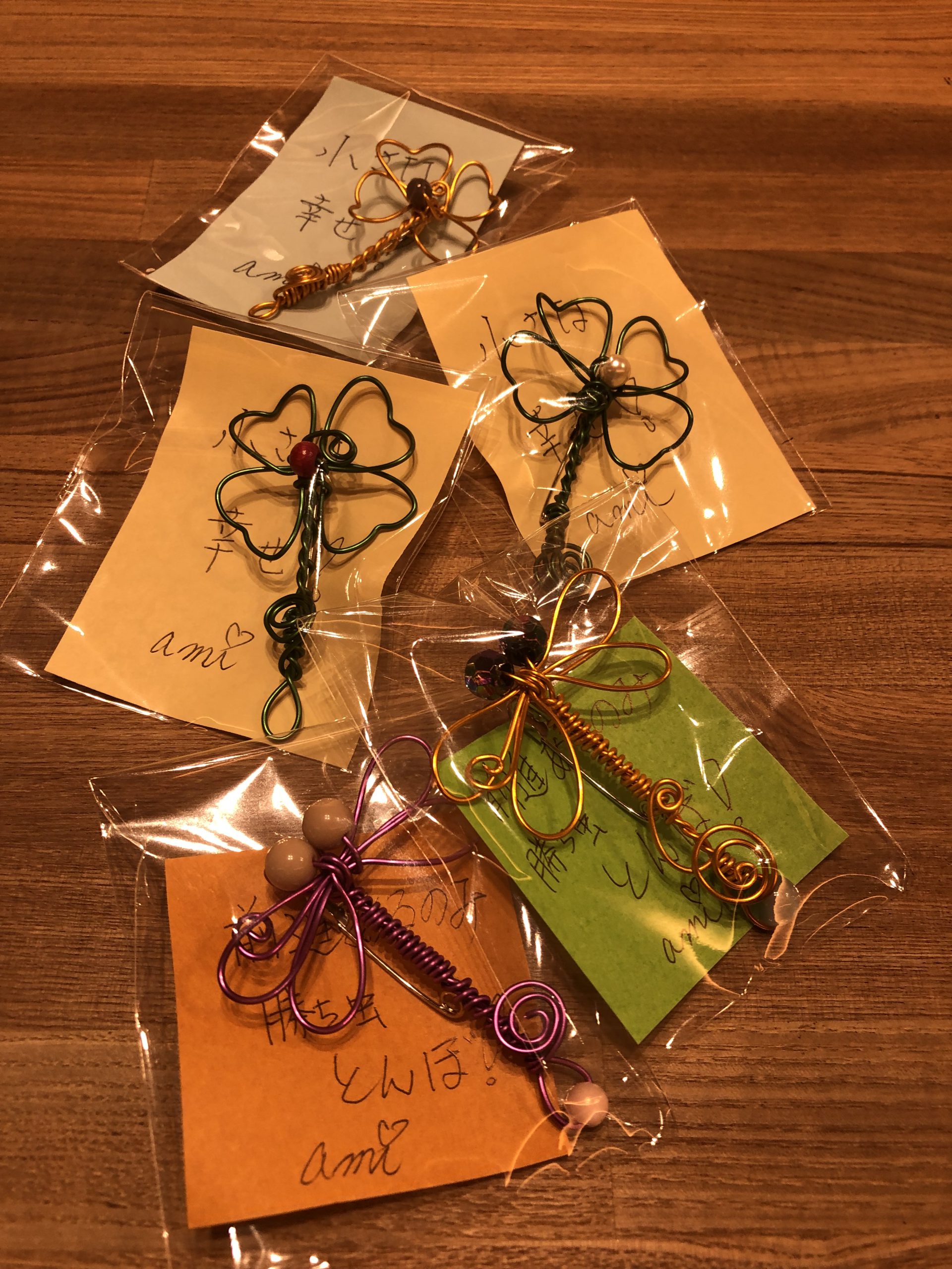 石川県に大雨警報が出ていましたが、初めての方やいつもの方が参加して下さいました。コロナ感染拡大の中なのでエアコン全開で窓をあけてのおしゃべりでした。ワイヤーアート作家さんのNさんがトンボと四つ葉のクローバーのブローチをたくさん持ってきてくださいました。