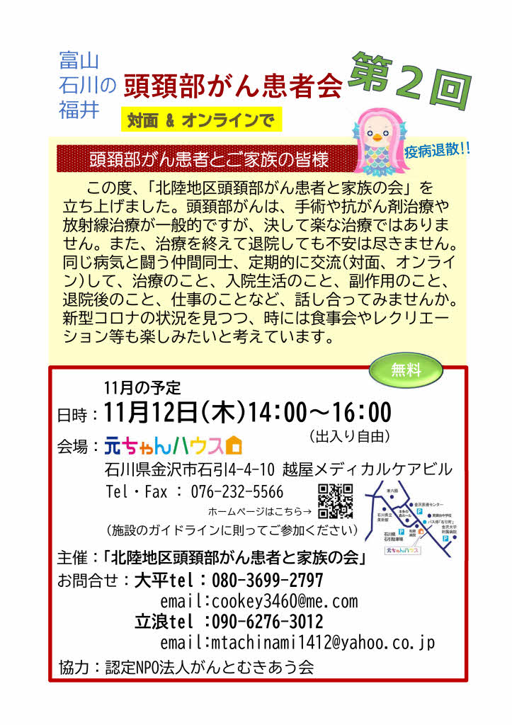 11月12日(木)14:00~16:00に、「北陸地区頭頚部がん患者と家族の会」主催で、