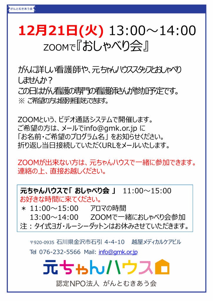 毎月第4火曜日に開催している「おしゃべり会」ですが、今月は12月21日に開催します。