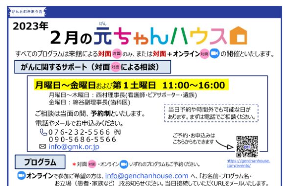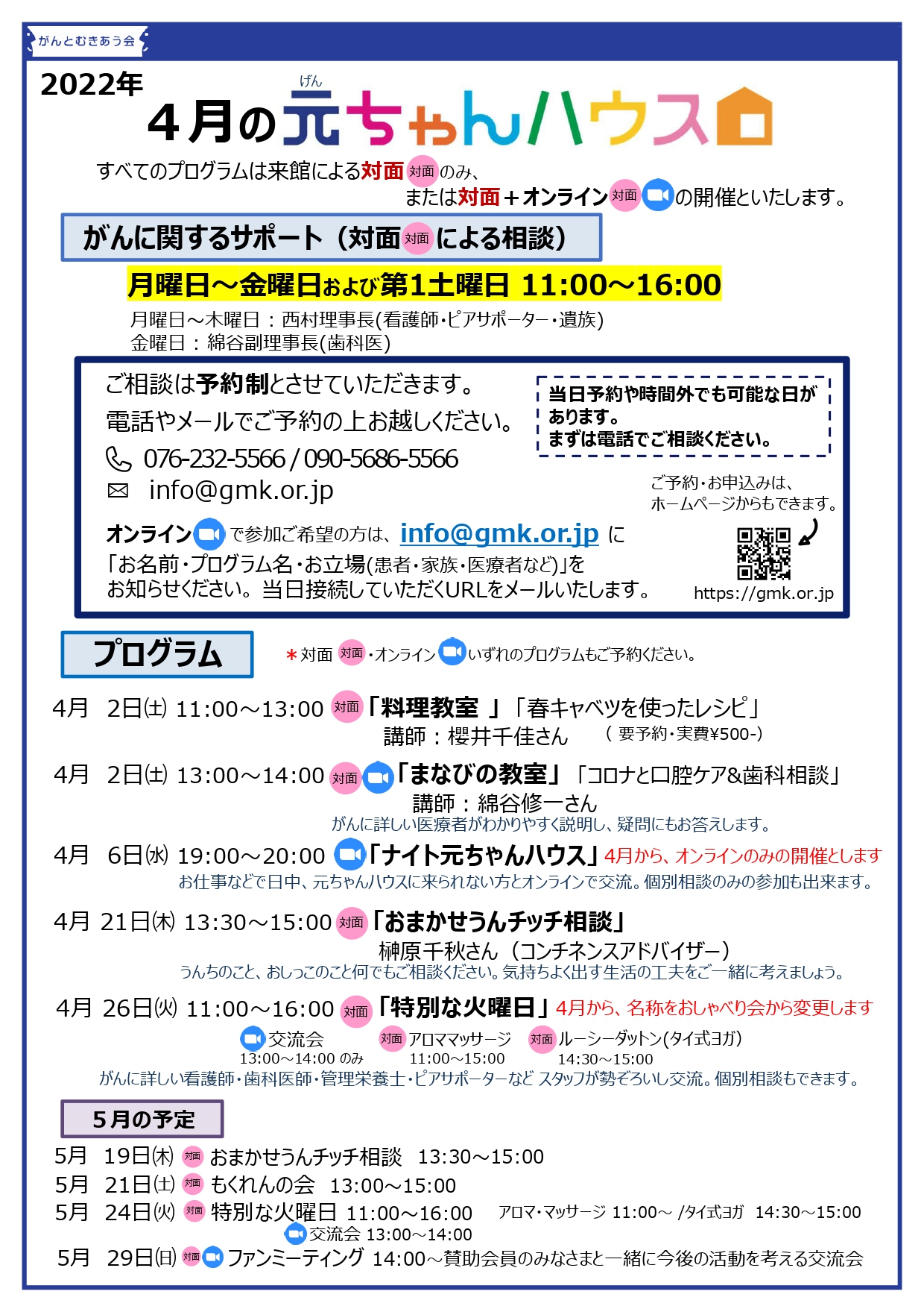 今年度のプログラムは、料理教室・おまかせうんチッチ相談・特別な火曜日(交流会以外)・もくれんの会:元ちゃんハウスでの対面のみの開催、