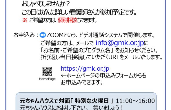 まなびの教室・時別な火曜日(交流会のみ)、元ちゃんハウスでの対面+オンラインでの開催、