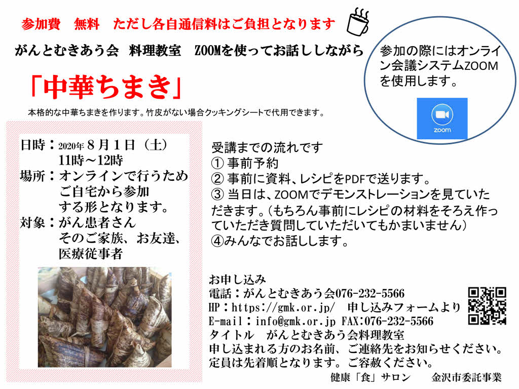 8月の料理教室は、ZOOMを利用したオンライン料理教室「中華ちまき」です。