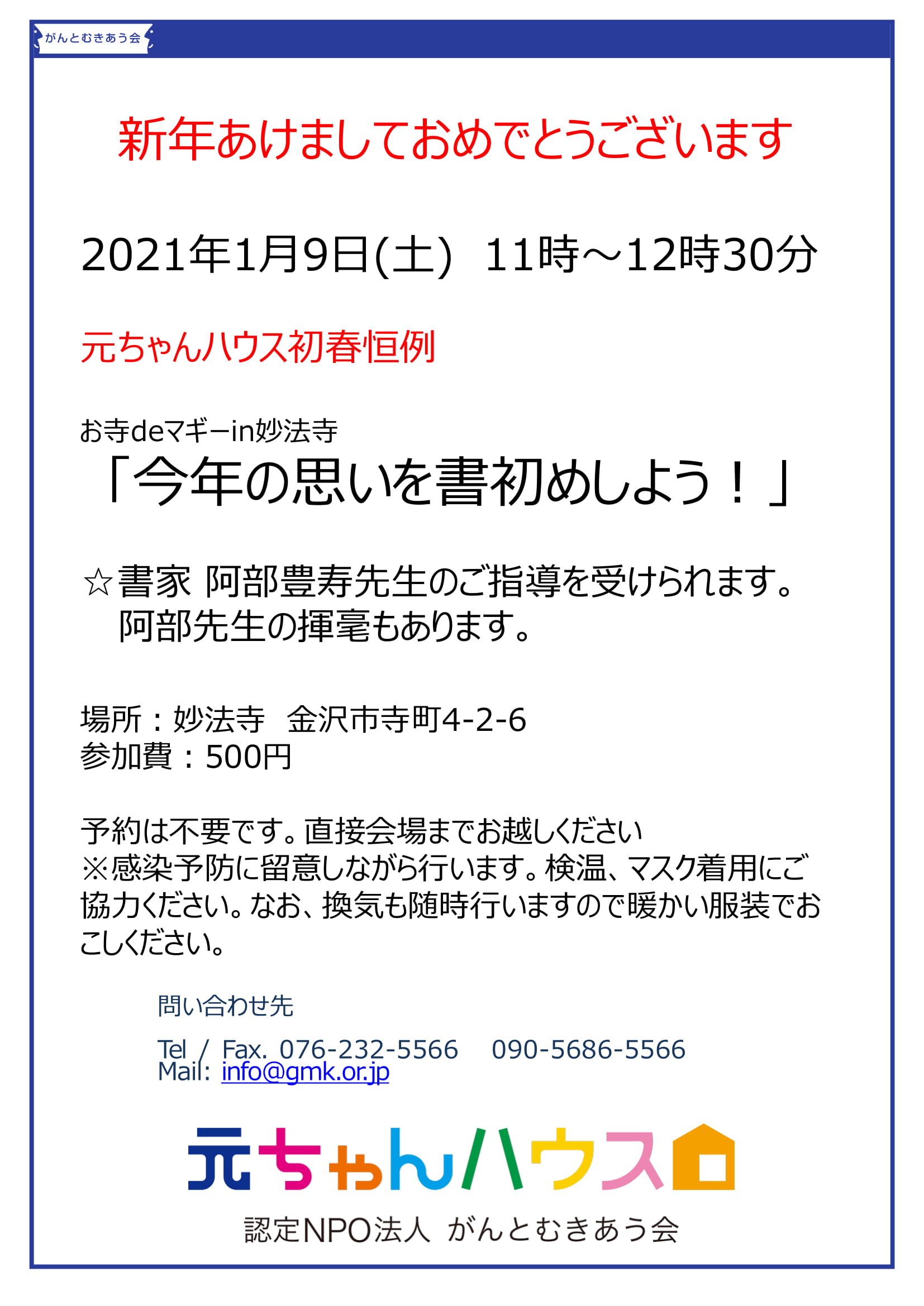 • お問い合わせ:元ちゃんハウス Tel:076-232-5566 090-5686-5566 e-mail:info@gmk.or.jp