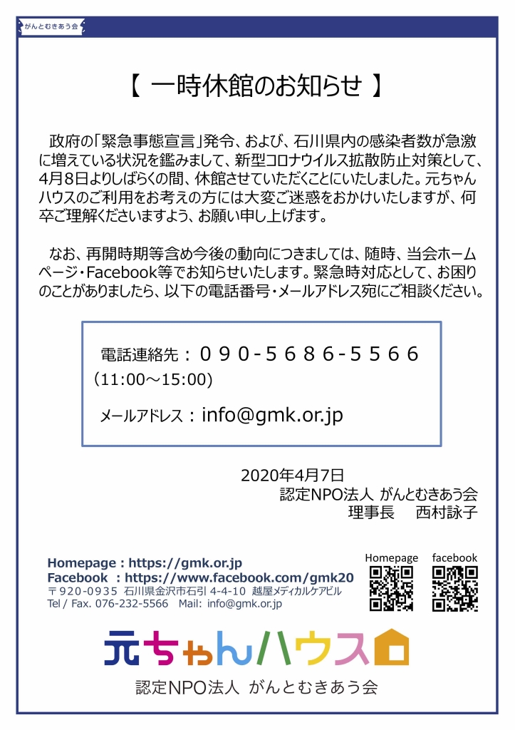 政府の「緊急事態宣言」発令、および、石川県内の感染者数が急激に増えている状況を鑑みまして、新型コロナウイルス拡大防止対策として、4月8日よりしばらくの間、元ちゃんハウスを休館いたします。ご利用をお考えの方には大変ご迷惑をおかけいたしますが、何卒ご理解くださいますよう、お願い申し上げます。