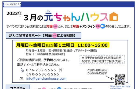 なお、4月のイベントカレンダーに記載の各種プログラムにつきましては、元ちゃんハウスの再開まで、中止いたします。再開時期等含め、今後の動向につきましては、随時、当会ホームページ・Facebook等でお知らせいたします。