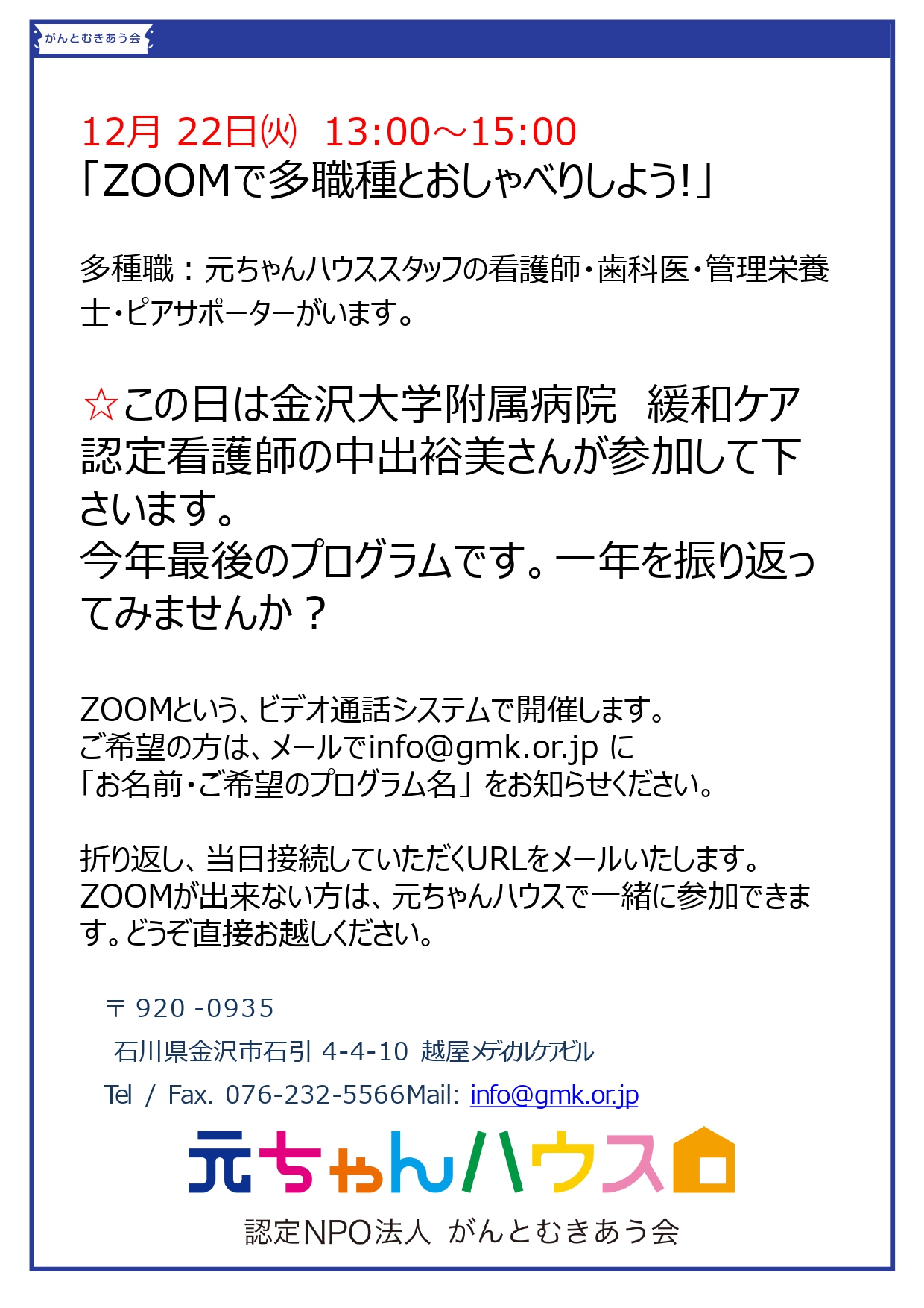12月22日(火)13:00~15:00の予定で、ZOOMによるオンラインおしゃべり会を開催します。