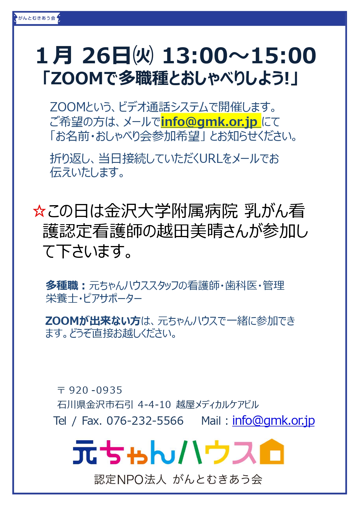 1月26日(火)13:00~15:00の予定で、ZOOMによるオンラインおしゃべり会を開催します。