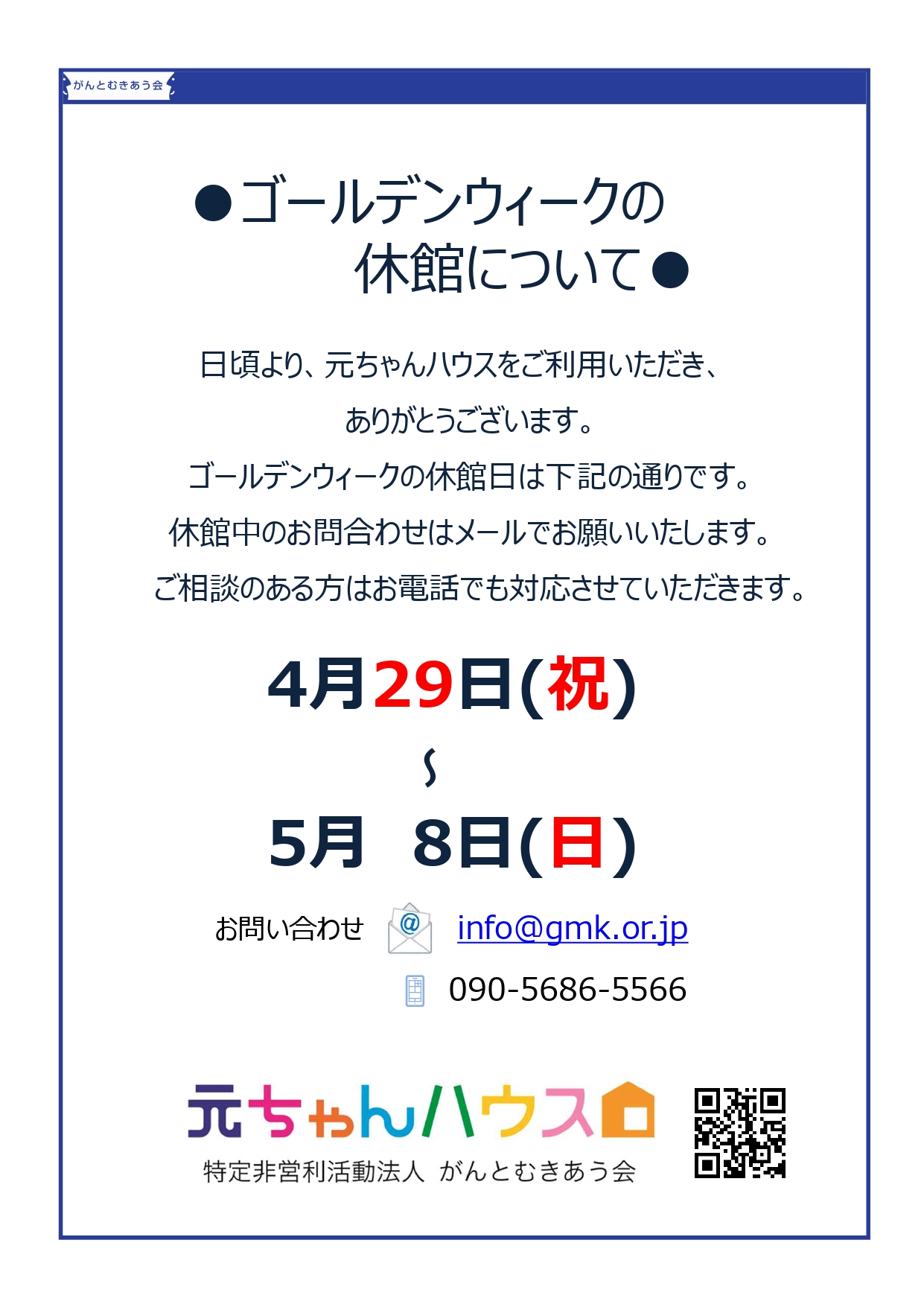 元ちゃんハウスは4月29日から5月8日まで休館させていただきます。お休みはなりますが、お問い合わせや、ご相談があれば、お電話でもメールでも構いませんのでご連絡ください。どうぞよろしくお願い致します。