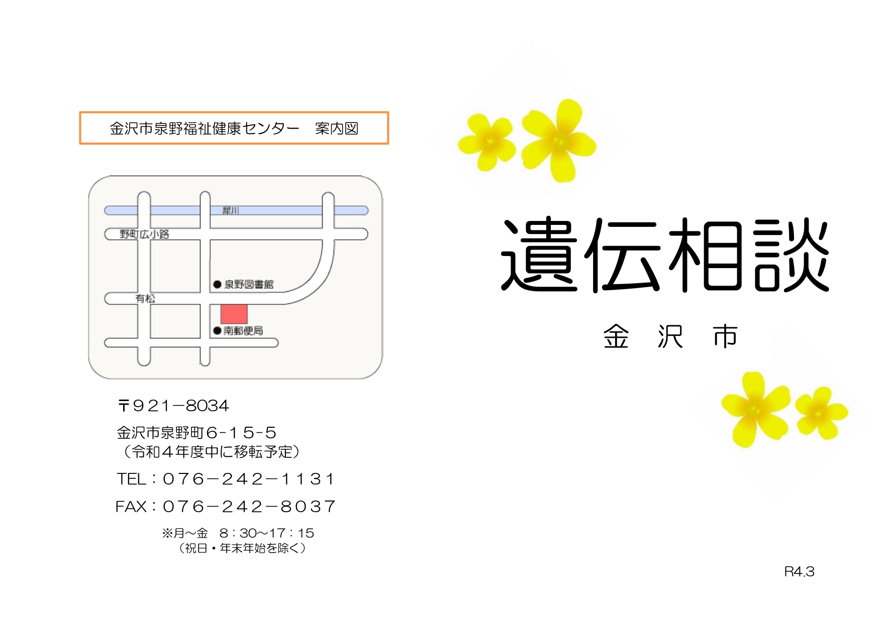 2022.05.13 小児慢性特定疾病児童等自立支援事業からのお知らせです。 元ちゃんハウスは金沢市から小児慢性特定疾病児童等自立支援事業を委託されています。 金沢市では遺伝相談を行っています。チラシをご参照ください。 金沢市のホームページ https://www4.city.kanazawa.lg.jp/soshikikarasagasu/izuminofukushikenkocenter/gyomuannai/3/1/5407.html 金沢市遺伝相談チラシPDF Post Share RSS 元ちゃんハウス・ファンミーティング2022のご案内 6月11日第44回まなびの教室のお知らせ